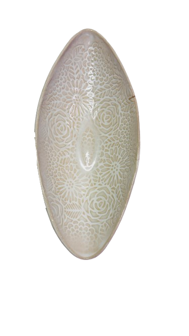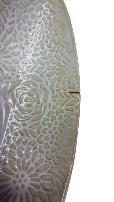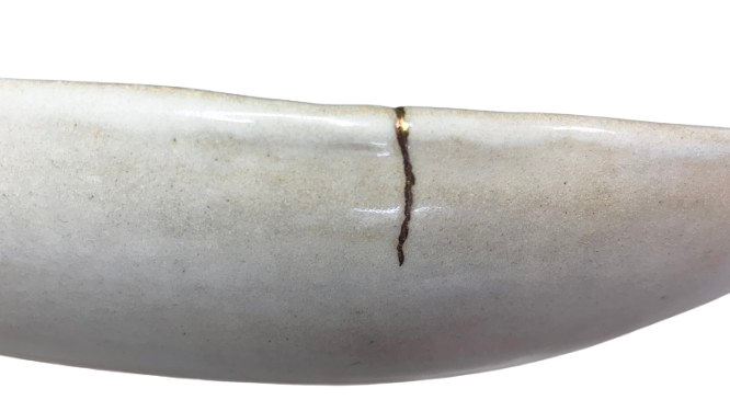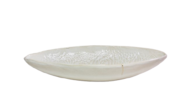 Dyp fatskål med delikat mønster i kremfarge. Med kintsugi teknikk, hvor et lite skår har blitt dekket av en gullfarget åre. 34 cm L x 15 B x 6 H